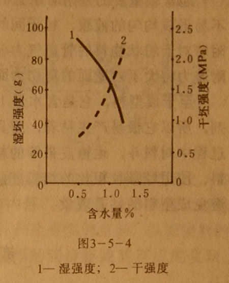 就陶瓷磨具成型料而言,磨具坯的濕坯強度與干坯強度,在其他條件相同時,與成型料的潤濕狀態有關.多次試驗表明,對于同一種成型料,其他條件均相同,僅改變其干濕程度,較干(但仍能成型)的成型料,有著較高的濕坯強度和較低的干坯強度,而較濕的成型料,其濕坯強度低但干坯強度高,見圖3一5-4.